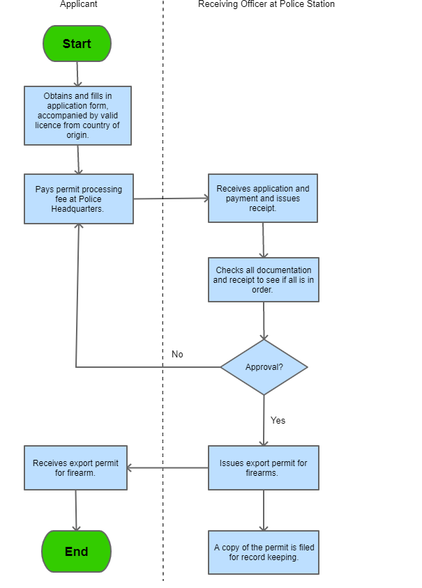 | Export Permit of Firearms | Permit Requirement | | For every firearm that is to be exported, a valid licence from the country of origin and certificate of registration is required. | Application is only done at the police station. | The Arms And Ammunition Act, 1966 | 09-09-9999 | Good |