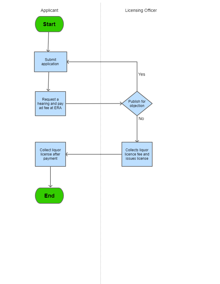 License, or the renewal of an existing License, or the transfer of an existing License from the holder thereof, or the removal of an existing License from the licensed premises to other premises, shall on or before the first day of October, if the application is to be heard at an annual meeting, or the first day of April, if the application is to be heard at a mid-year meeting, lodge a written application with the Chairman of the Board at the office of the Minister for Home Affairs and copies thereof with the Commissioner of Police and the Senior Medical Officer of Health. | Liquor licences are issued twice a year in May/June and also in November/December of each year. | The Trading Licenses Order 20 of 1975 | 09-09-9999 | Good |