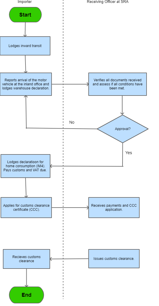 Declaration of inward transit for motor vehiclesDuty/Tax Payable An inward transit declaration shall be made for motor vehicles imported from non-SACU countries and which are covered by a bond. The transit shall be acquitted by an appropriately framed warehouse declaration (IM7) or an import declaration for home use (IM 4) which is properly linked to the transit declaration (IM 8) in order to enable generation of manifest and acquittal of the transit note (T1)The Customs and Excise Act, 197109-09-9999Good